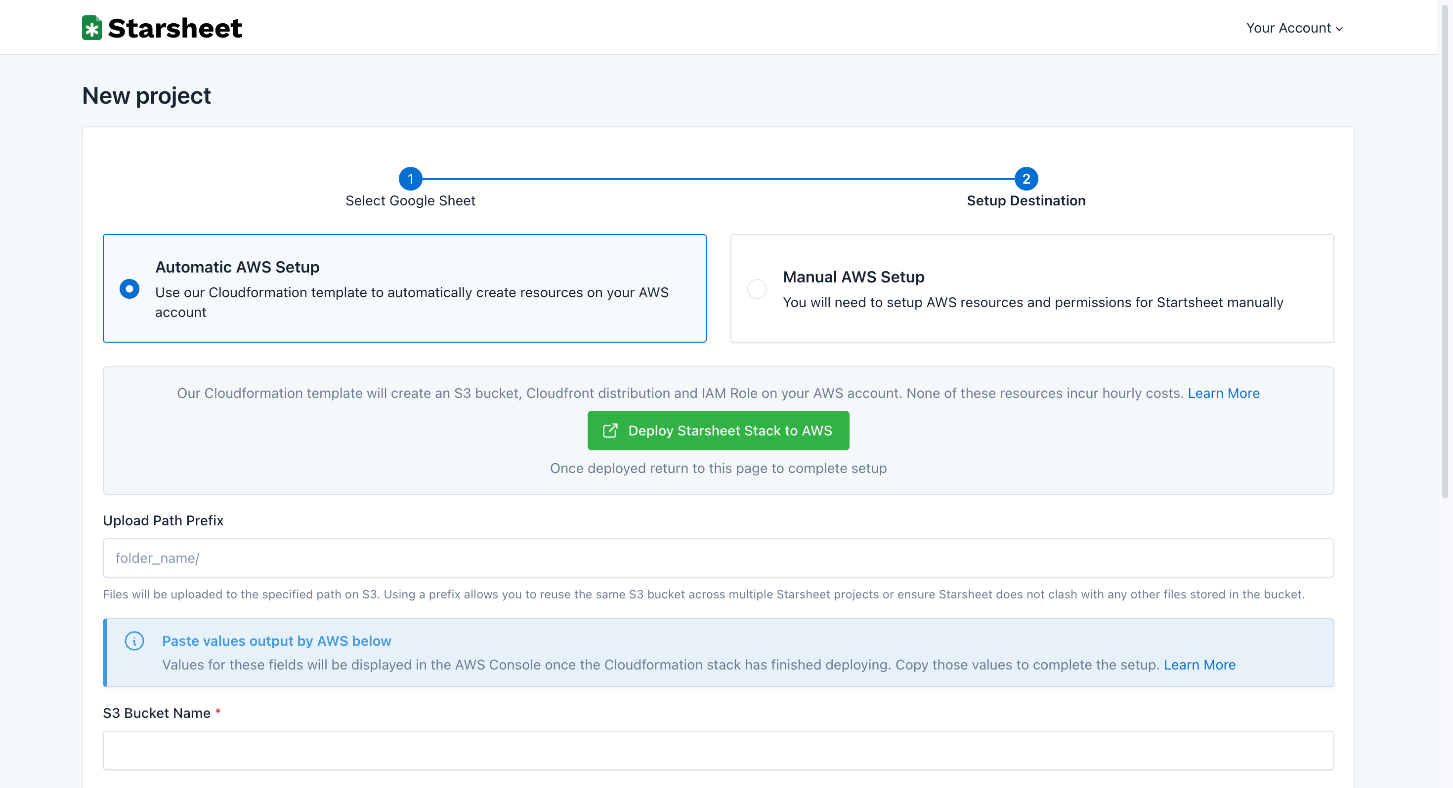After selecting your Google Sheet, select ‘Automatic AWS Setup’ and follow these steps:1