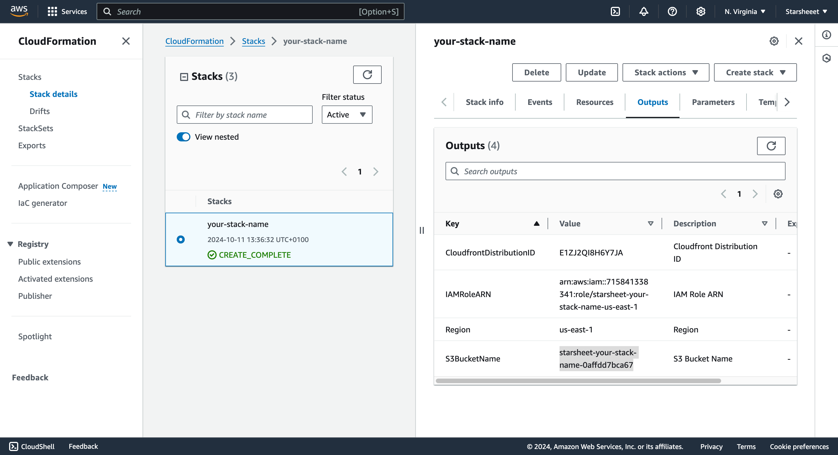 starsheet-{YOUR_STACK_NAME}-{GENERATED_UNIQUE_ID}.The generated unique ID is added to prevent clashes because S3 bucket names must be globally unique across all AWS customers.