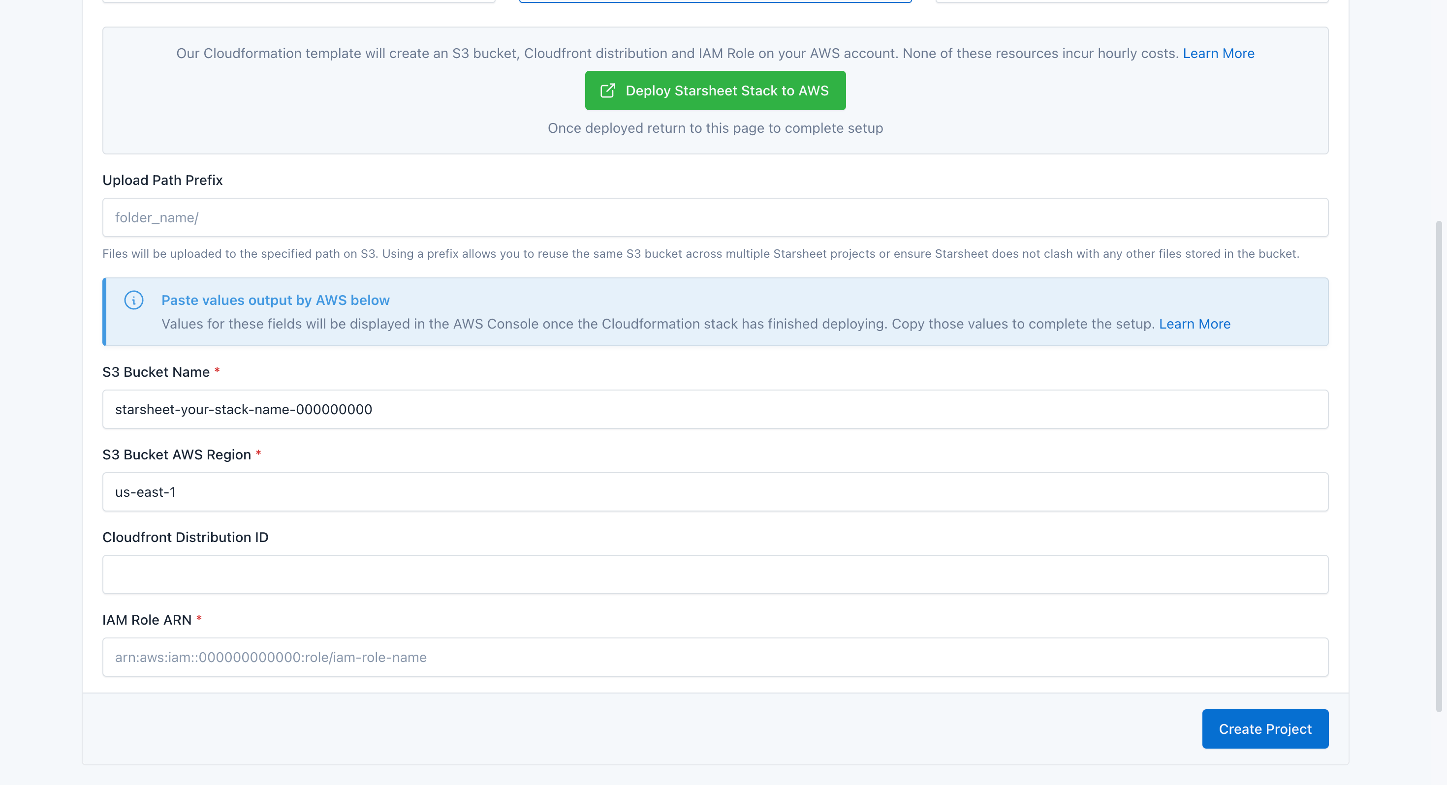 Copy the values form the outputs tab to the relevant fields in the project creation form